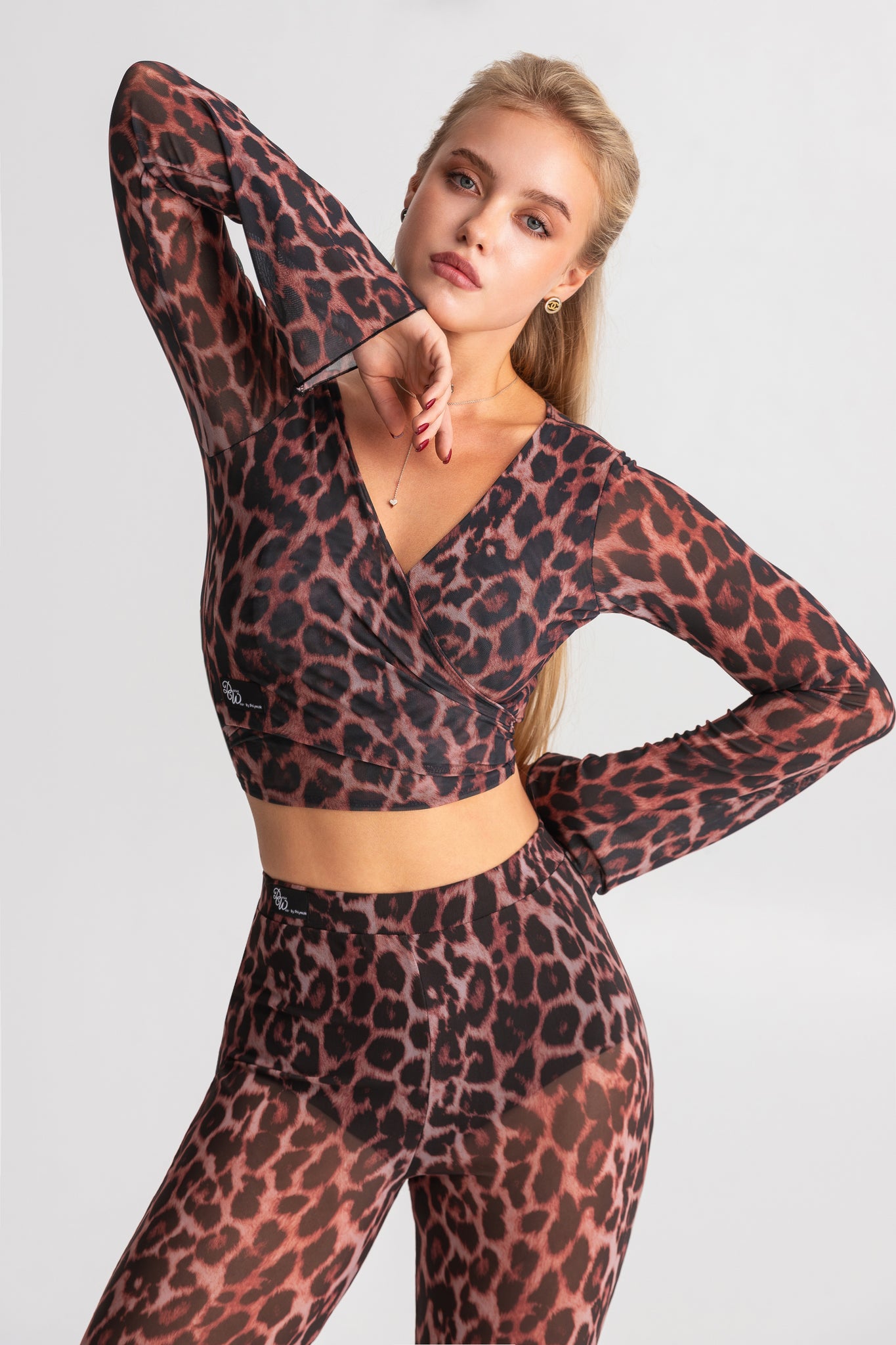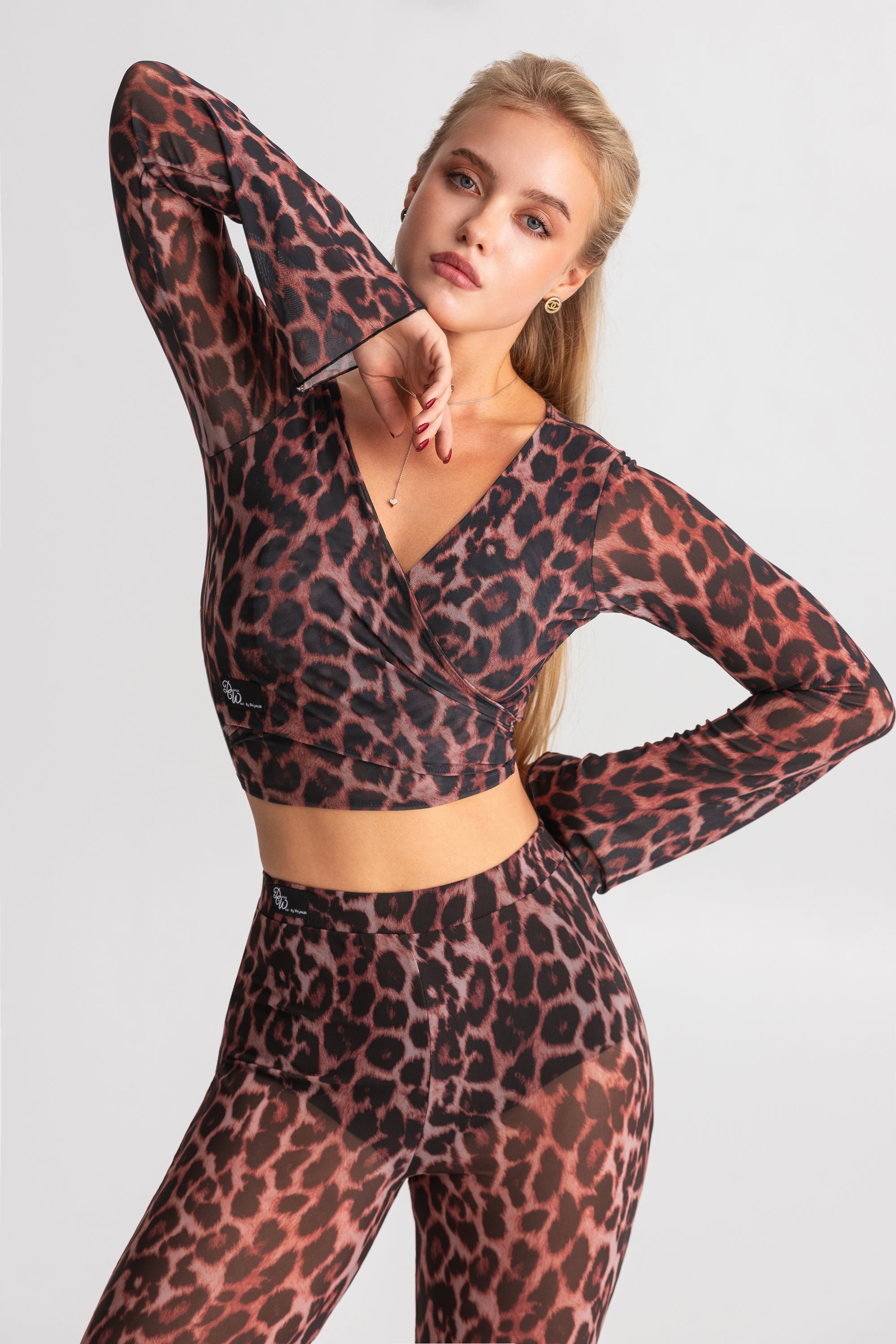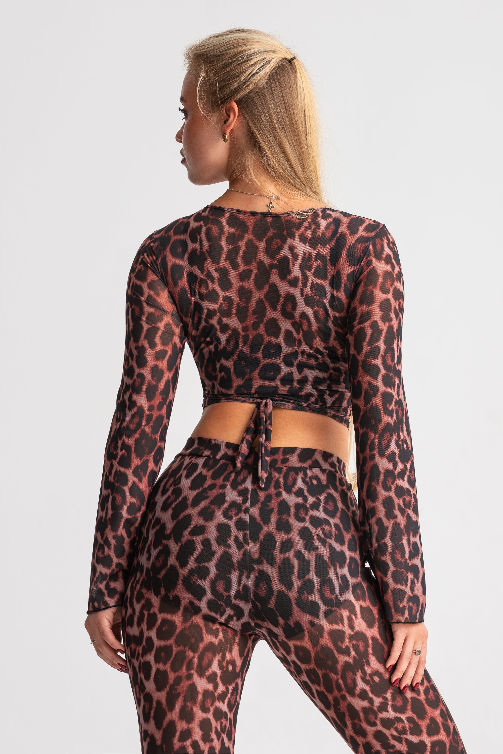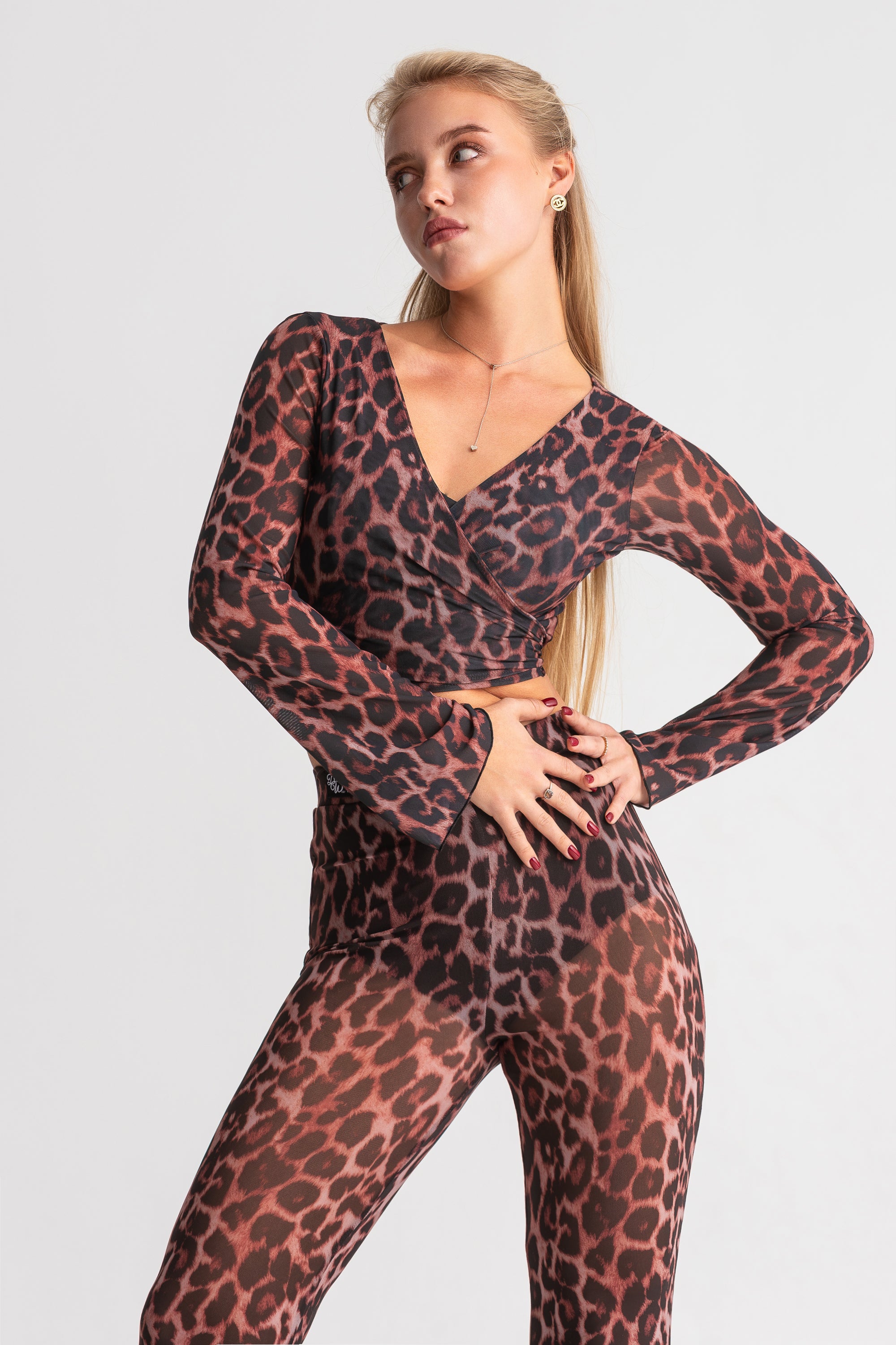 Sophisticated wrap top crafted entirely from semi-sheer mesh with a striking leopard print. The deep V-neckline and long sleeves create an elegant silhouette, while the wrap design with tie closure allows for an adjustable, personalized fit that flatters every body type.