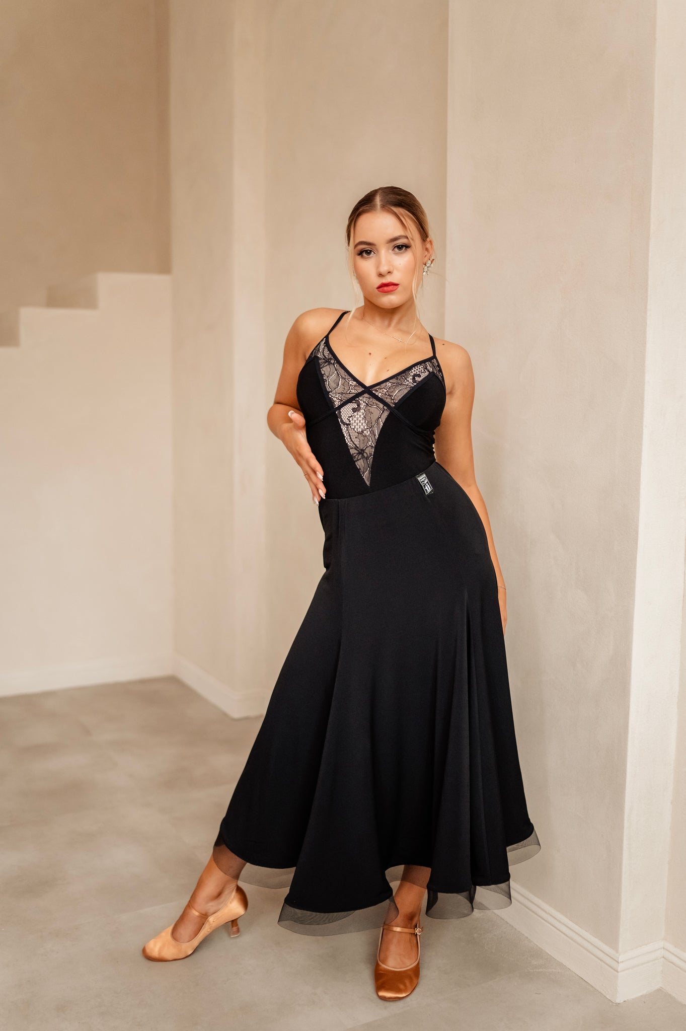 Radiate elegance and allure with the Noir Eclat leotard. This black masterpiece is designed to captivate with its plunging V-neckline framed by delicate lace inserts, adding a hint of sophistication. The intricate lace detailing continues in a triangular design, accentuating the silhouette with a subtle yet striking charm.
